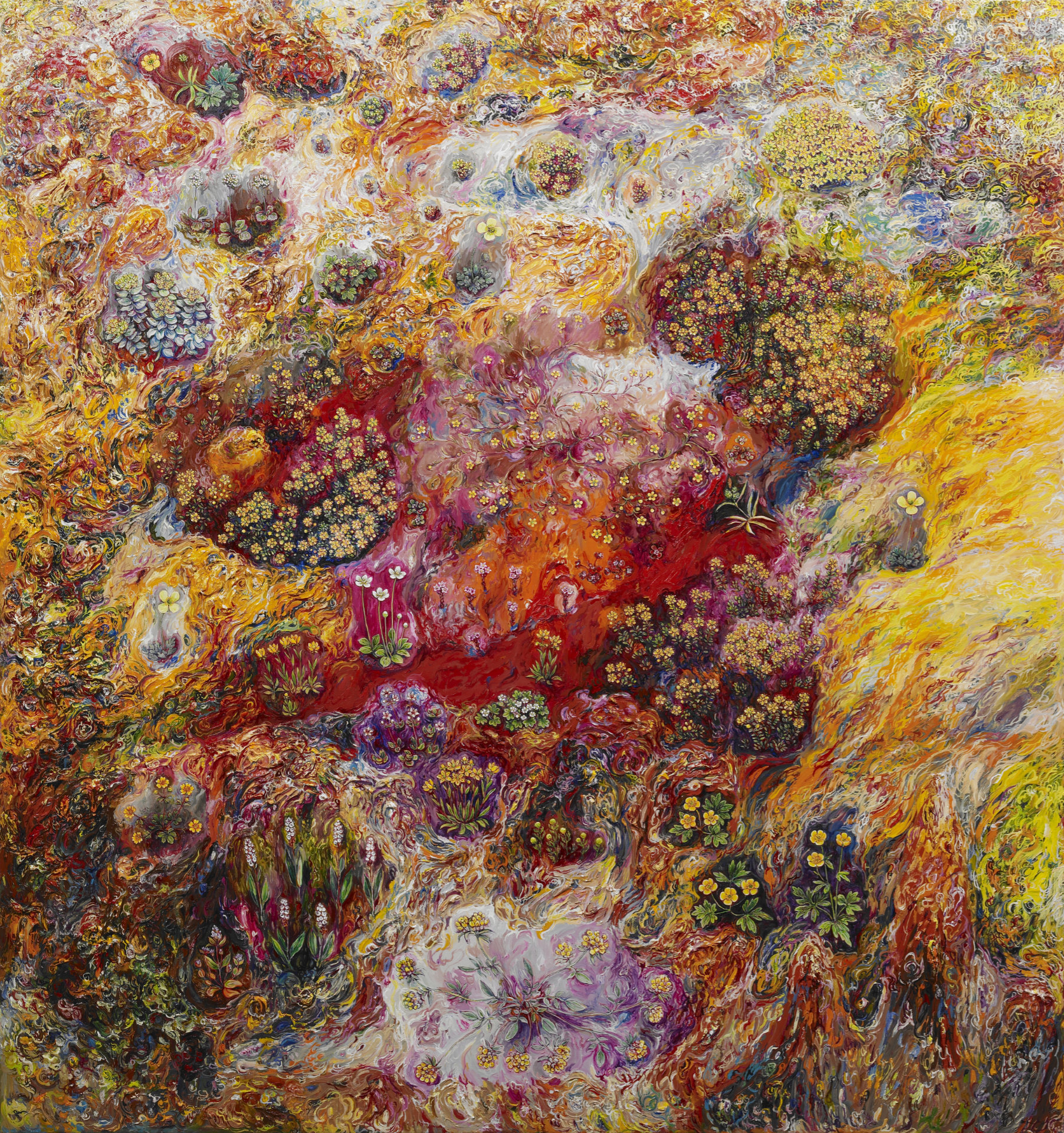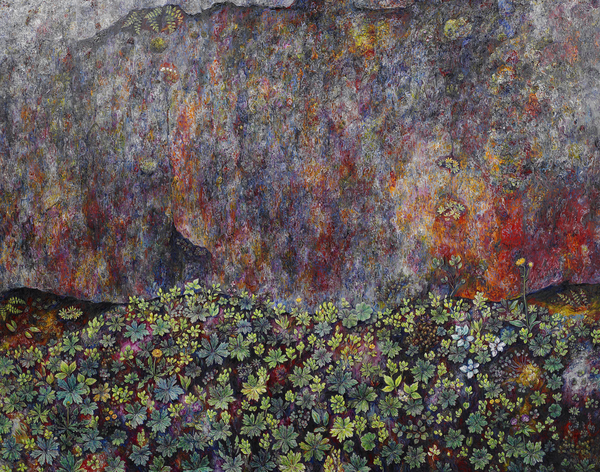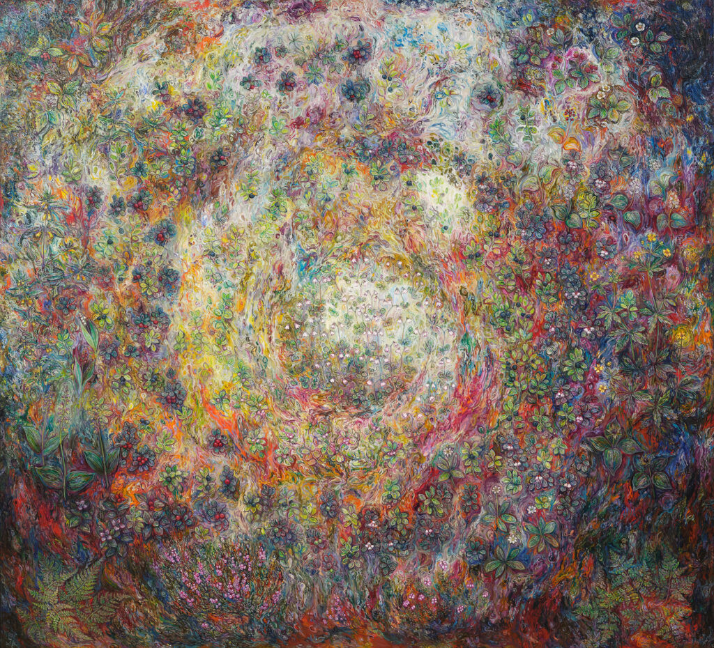 At the heart of Eggert Pétursson’s (b. 1956) art lies the Arctic flora. Drawing on an intimate knowledge of Icelandic vegetation and its volcanic landscapes, the artist invents compositions that are both botanically precise and phantasmagorical, earthly and otherworldly. Attuned to the scale of the tundra’s resilient flowers, mosses, and blossoms, Pétursson opens entire universes in his paintings.