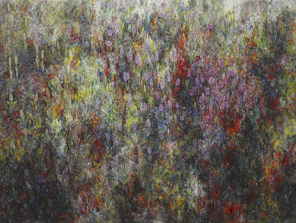 Pétursson’s works range from meticulously realistic depictions of plants repeated like patterns on an endless seeming canvas to almost abstract compositions, where layered paint creates relief-like surfaces. His art is both timely and timeless, it resonates with contemporary ecological and posthumanist concerns while also standing out through visually striking compositions that connect to traditions of abstraction, formalism, and conceptual art.